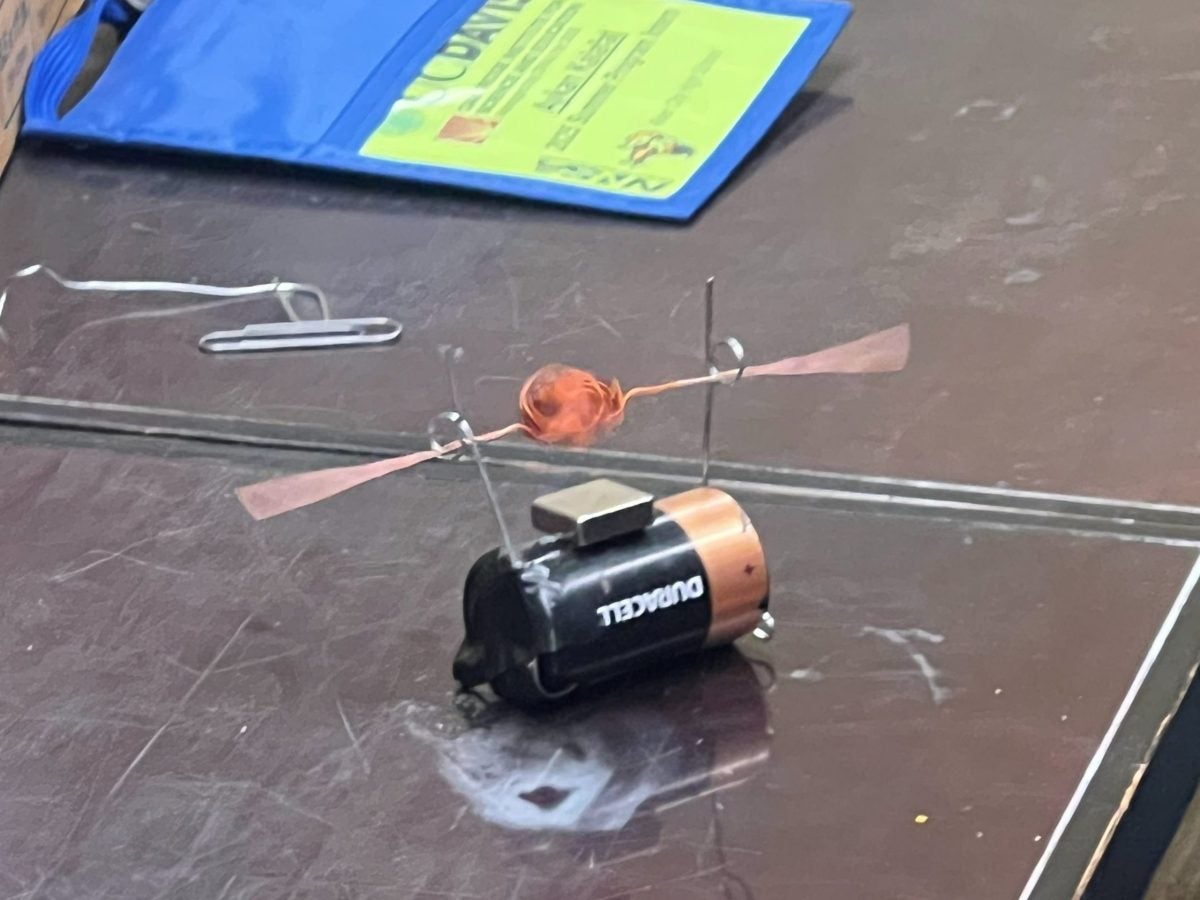 | What we do- Part 4: Learning how electrical motors work. Our drones have of them! We even test our hands-on skills and build an electrical motor ourselves, using a battery, a copper wire, and a magnet. |